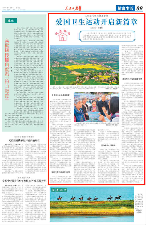 近日,在国家卫生健康委举行的新闻发布会上,全国爱卫办常务副主任、国家卫生健康委规划司司长庄宁介绍,自2020年《国务院关于深入开展爱国卫生运动的意见》印发实施以来,多部门共同参与,围绕各项重点任务,推动爱国卫生运动取得积极进展。